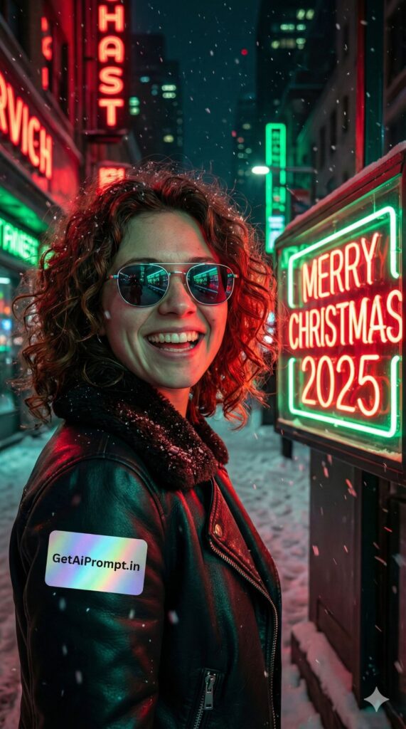 A cinematic, high-contrast cyberpunk Christmas portrait. The subject [100% identical face and gender as uploaded image] is standing in a snowy street at night, illuminated by bright Neon Lights. Outfit: Stylish winter streetwear, leather jacket with fur collar, and cool sunglasses reflecting the lights. Background: A futuristic city street with neon red and green signs. Text Integration: A bright Neon Sign next to the subject glowing with the words "Merry Christmas 2025". Vibe: Edgy, cool, aesthetic. In-Context Branding: "GetAiPrompt.in" is visible as a holographic sticker on the subject's jacket. --ar 9:16