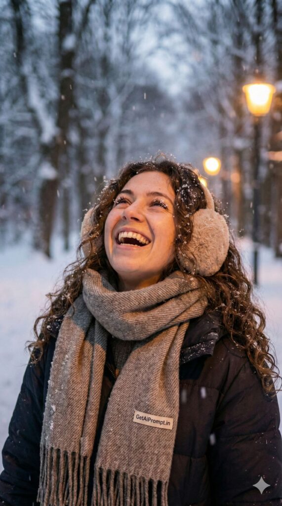 A candid, photorealistic outdoor winter shot with falling snow. The subject [100% identical face and gender as uploaded image] is laughing naturally, looking away from the camera or at the falling snow. Outfit: Thick woolen scarf, ear muffs, and a puffer jacket. Snowflakes are caught in their eyelashes and hair. Background: A blurred winter forest or snowy street with street lamps. Vibe: Serotonin, oxytocin, romantic winter vibes. In-Context Branding: "GetAiPrompt.in" is subtly embroidered on the label of the scarf. --ar 9:16