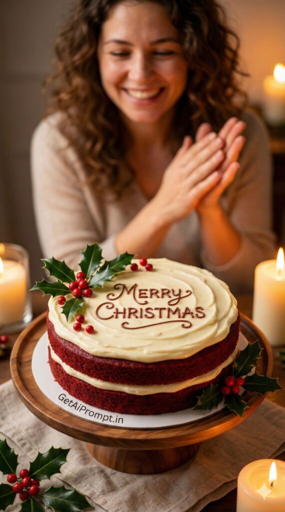 A high-angle, appetizing food photography shot of a luxurious Christmas Cake. The subject [100% identical face and gender as uploaded image] is visible in the background (soft focus), clapping hands and smiling. Foreground: Sharp focus on a rich Red Velvet or Chocolate cake decorated with holly and berries. Text Integration: The text "MERRY CHRISTMAS" and the [User's Name Placeholder] is written elegantly in icing on the cake. Lighting: Warm candlelight. In-Context Branding: "GetAiPrompt.in" is printed on the napkin under the cake. --ar 9:16