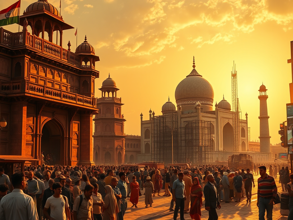 "Photorealistic image at coordinates 27.175° N, 78.042° E in the year 1640. Show the Taj Mahal surrounded by wooden scaffolding and elephants carrying white marble stones. Dusty atmosphere, historical construction site."