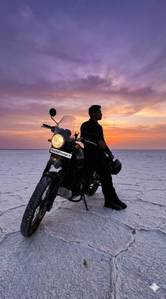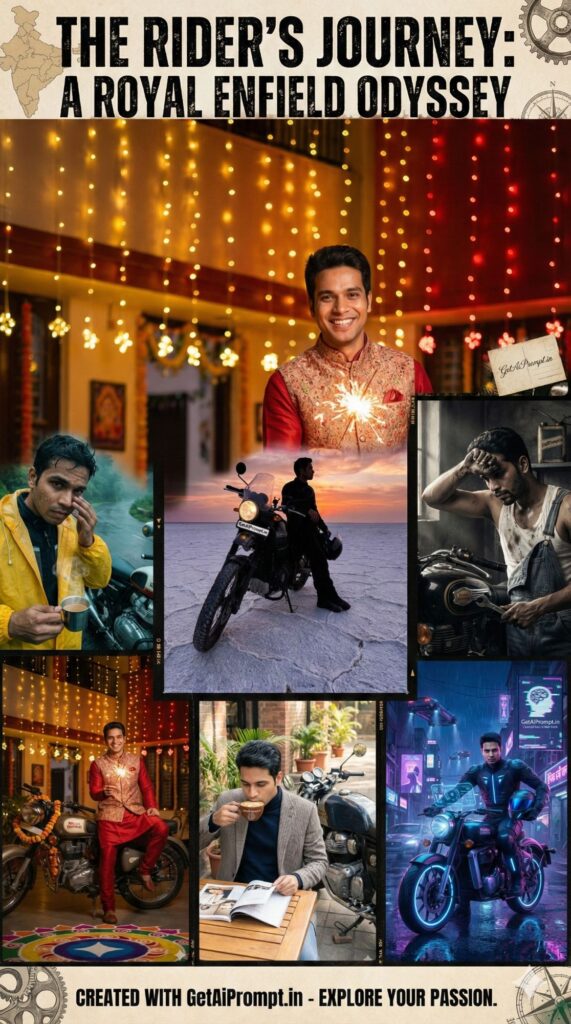 Create cinematic Royal Enfield portraits that look exactly like you—bina studio ya mehenge camera ke. Ye prompts aapki social media feed par wo “main character energy” lekar aayenge jo sabko scroll rokne par majboor kar de.