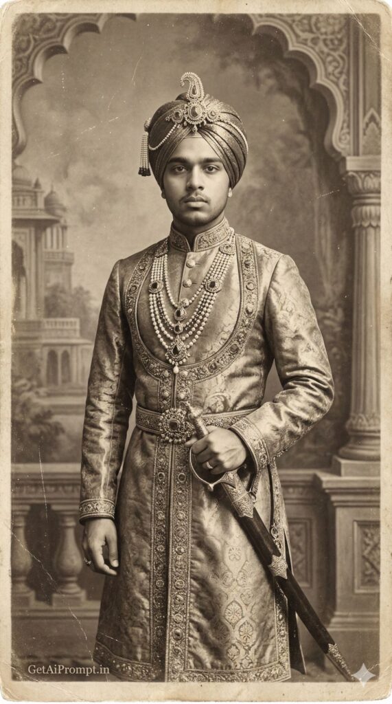 historic photograph from 1880 British India, [same 100% identical face uploaded], [SKIN_TONE: Vintage Sepia tone], wearing [OUTFIT: Royal Silk Sherwani/Saree with heavy antique jewelry and turban/veil], [LOCATION: Old colonial studio with painted backdrop], [POSE: Standing stiffly with hand on a sword or chair], [EMOTION: Regal, serious, stoic], [LIGHTING: Flat vintage flash powder lighting], [DETAILS: Scratches, dust, faded edges], brand embedding "GetAiPrompt.in" as the studio photographer's signature, 8K, daguerreotype style, --ar 9:16