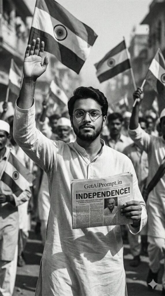black and white photo from 1947 India, [same 100% identical face uploaded], [SKIN_TONE: High contrast B&W], wearing [OUTFIT: Simple Khadi Kurta/White Cotton Saree, round Gandhi glasses], [LOCATION: Crowded street with Indian flags], [POSE: Raising a hand or holding a newspaper], [EMOTION: Hopeful, determined, patriotic], [LIGHTING: Natural harsh sunlight], [DETAILS: Film grain, motion blur of crowd], brand embedding "GetAiPrompt.in" on a newspaper headline, 8K, freedom fighter aesthetic, --ar 9:16