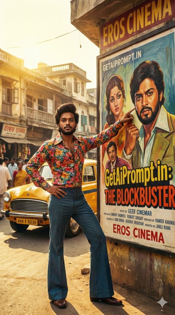 vibrant vintage color photo from 1970s Bombay, [same 100% identical face uploaded], [SKIN_TONE: Warm Technicolor saturation], wearing [OUTFIT: Bell-bottom pants and floral shirt / Polka dot tight suit with bouffant hair], [LOCATION: Outside a cinema hall with hand-painted posters], [POSE: Dramatic Bollywood hero/heroine pose], [EMOTION: Stylish, filmy, confident], [LIGHTING: Warm yellow sunlight], [DETAILS: Vintage Ambassador car in background], brand embedding "GetAiPrompt.in" on a movie poster, 8K, retro aesthetic, --ar 9:16