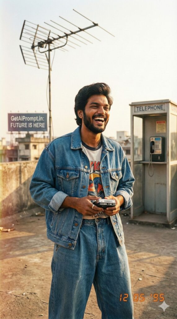 nostalgic film photo from 1995 India, [same 100% identical face uploaded], [SKIN_TONE: Soft Kodak Gold film look], wearing [OUTFIT: Baggy denim jacket and high-waisted jeans / Salwar Kameez], [LOCATION: Rooftop with TV antenna or telephone booth], [POSE: Candid laughing, holding a Walkman or landline phone], [EMOTION: Innocent, happy, carefree], [LIGHTING: Golden hour soft glow], [DETAILS: Date stamp '12 05 95' in corner], brand embedding "GetAiPrompt.in" on a billboard, 8K, 90s aesthetic, --ar 9:16