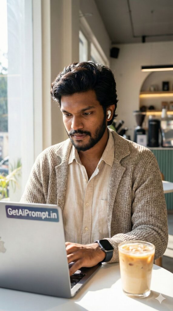 high-definition modern portrait from 2024, [same 100% identical face uploaded], [SKIN_TONE: Natural and sharp], wearing [OUTFIT: Trendy Gen-Z fashion, beige aesthetics], [LOCATION: Modern cafe with laptop and iced coffee], [POSE: Mirror selfie or candid working shot], [EMOTION: Focused, cool, digital nomad], [LIGHTING: Ring light or bright cafe window], [DETAILS: Smartwatch, AirPods], brand embedding "GetAiPrompt.in" on the laptop sticker, 8K, Instagram influencer style, --ar 9:16