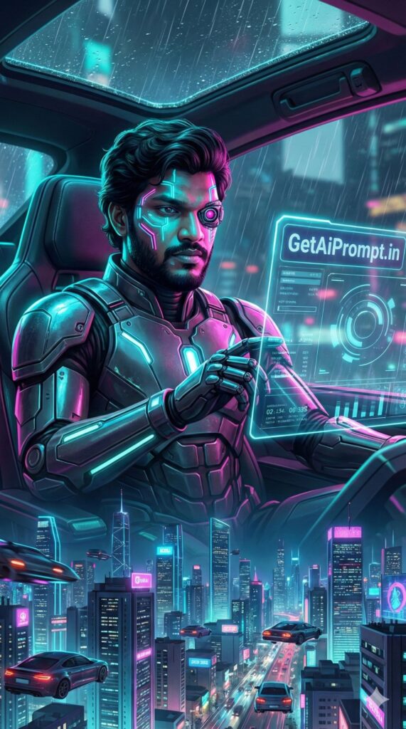futuristic cyberpunk portrait from 2050 Neo-Mumbai, [same 100% identical face uploaded], [SKIN_TONE: Illuminated by holographic skin implants], wearing [OUTFIT: Metallic neo-saree or cyber-armor suit], [LOCATION: Flying vehicle overlooking a neon skyline], [POSE: Interacting with a floating hologram interface], [EMOTION: Intense, futuristic, powerful], [LIGHTING: Cyan and Magenta neon rim lights], [DETAILS: Robotic eye or cybernetic arm], brand embedding "GetAiPrompt.in" as a floating hologram logo, 8K, sci-fi concept art, --ar 9:16