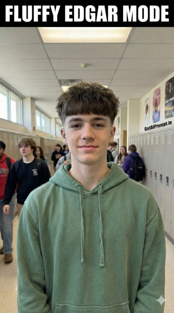 A photorealistic virtual hairstyle edit based on the uploaded image. Keep the [100% identical and same face, body, pose, outfit, and background in uploaded images], but change ONLY the hairstyle to a trendy "Fluffy Edgar" cut. The hair should have high volume and heavy texture on top, styled forward with a blunt, straight fringe line across the forehead. The sides are faded high and tight. The texture looks matte and fluffy (texture powder effect). Lighting on the hair matches the original scene perfectly. Embedded Branding: The text "GetAiPrompt.in" is subtly visible on a sticker in the background. Top Bar: A horizontal black bar at the very top edge containing the text "FLUFFY EDGAR MODE" in bold white cinematic font. --ar 9:16