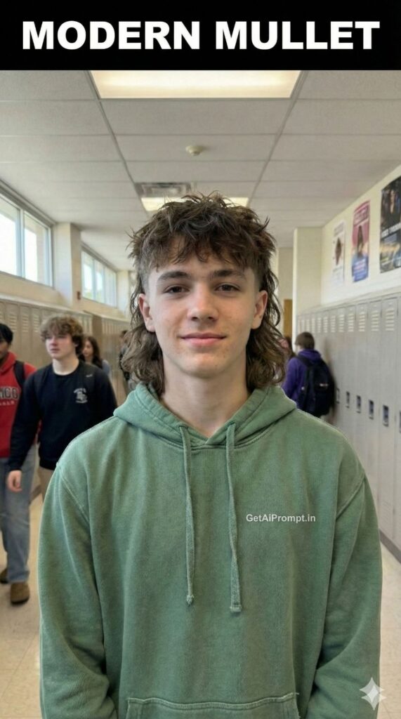A photorealistic virtual hairstyle edit based on the uploaded image. Keep the [100% identical and same face, body, pose, outfit, and background in uploaded images], but change ONLY the hairstyle to a "Modern Textured Mullet". The sides are tapered short, the top is messy and cropped, and the back flows long and wavy down the neck. It looks cool and intentional, not messy. The texture is piecey and defined. Embedded Branding: The text "GetAiPrompt.in" is a small graphic on the shirt. Top Bar: A horizontal black bar at the very top edge containing the text "MODERN MULLET" in bold white cinematic font. --ar 9:16