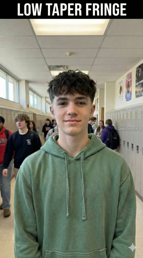 A photorealistic virtual hairstyle edit based on the uploaded image. Keep the [100% identical and same face, body, pose, outfit, and background in uploaded images], but change ONLY the hairstyle to a "Low Taper Fade with Textured Fringe". The hair on top is messy and pushed forward, covering the forehead slightly. The sides are kept dark but cleaned up around the ears (low taper). It looks like a fresh, expensive barbershop cut. Embedded Branding: The text "GetAiPrompt.in" is subtly integrated into the background texture. Top Bar: A horizontal black bar at the very top edge containing the text "LOW TAPER FRINGE" in bold white cinematic font. --ar 9:16