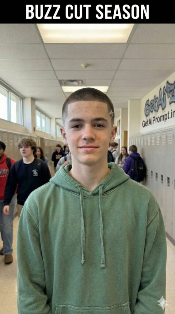 A photorealistic virtual hairstyle edit based on the uploaded image. Keep the [100% identical and same face, body, pose, outfit, and background in uploaded images], but change ONLY the hairstyle to a uniform "Buzz Cut" (Length #2). Add a sharp, simple razor line design (like a lightning bolt or slit) on one side. The hairline is lined up perfectly straight. The scalp visibility is realistic based on the lighting. Embedded Branding: The text "GetAiPrompt.in" is graffiti on a wall in the background. Top Bar: A horizontal black bar at the very top edge containing the text "BUZZ CUT SEASON" in bold white cinematic font. --ar 9:16