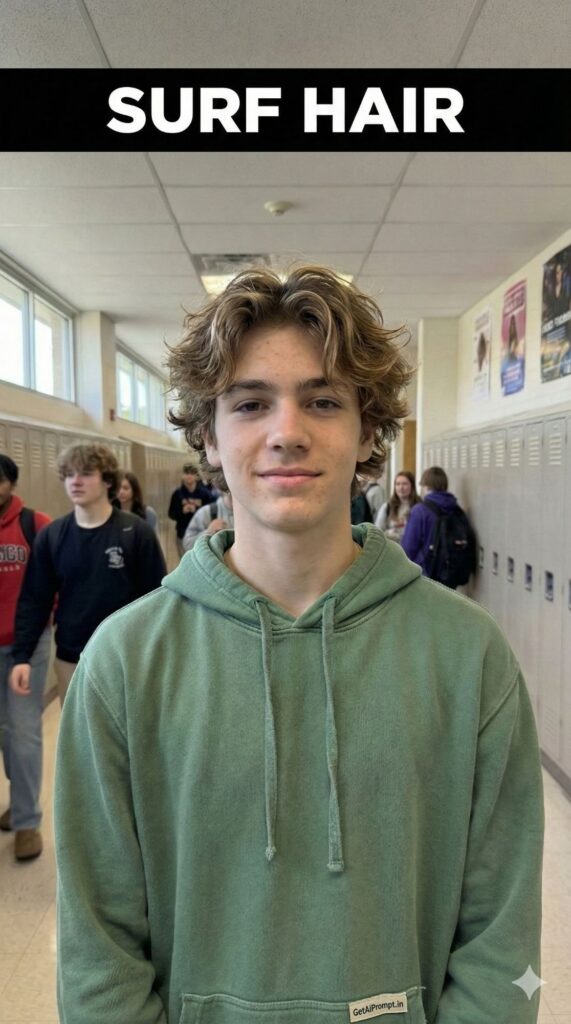 A photorealistic virtual hairstyle edit based on the uploaded image. Keep the [100% identical and same face, body, pose, outfit, and background in uploaded images], but change ONLY the hairstyle to a medium-length "Messy Surf Style". The hair looks tousled, wavy, and sun-kissed, as if they just came from the beach. It has volume and movement but no harsh lines. Embedded Branding: The text "GetAiPrompt.in" is on a small tag on the clothes. Top Bar: A horizontal black bar at the very top edge containing the text "SURF HAIR" in bold white cinematic font. --ar 9:16