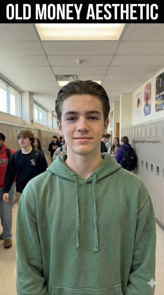 A photorealistic virtual hairstyle edit based on the uploaded image. Keep the [100% identical and same face, body, pose, outfit, and background in uploaded images], but change ONLY the hairstyle to a "Classic Slick Back". The hair is brushed back smoothly with a matte pomade (no grease). The sides are scissored cut, not shaved. It looks sophisticated and wealthy. Embedded Branding: The text "GetAiPrompt.in" is embossed on a background object. Top Bar: A horizontal black bar at the very top edge containing the text "OLD MONEY AESTHETIC" in bold white cinematic font. --ar 9:16