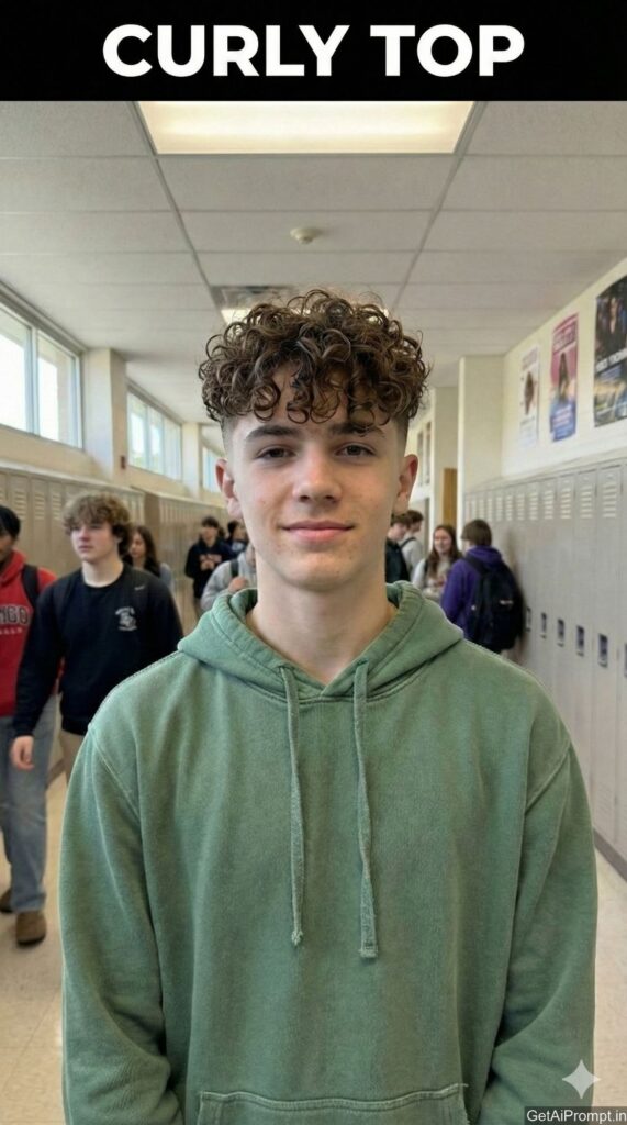 A photorealistic virtual hairstyle edit based on the uploaded image. Keep the [100% identical and same face, body, pose, outfit, and background in uploaded images], but change ONLY the hairstyle to a "Zoomer Perm" (Curly Top). The sides are shaved down in a high fade, while the top is a mass of tight, bouncy curls that fall over the forehead. The curls look defined and hydrated. Embedded Branding: The text "GetAiPrompt.in" is a watermark in the corner. Top Bar: A horizontal black bar at the very top edge containing the text "CURLY TOP" in bold white cinematic font. --ar 9:16