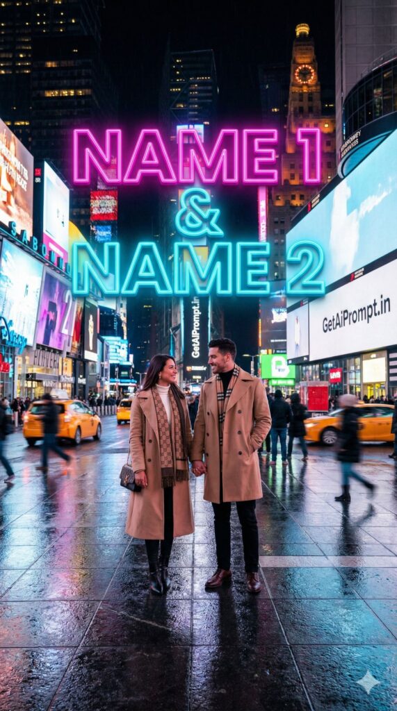 [Visual Style: Hyper-Realistic Urban Photography] [CRITICAL: ensure the subjects have a 100% identical facial structure, skin tone, and features as the reference image provided] [Subject: The couple standing confidently in the center of a bustling Times Square, New York at night, illuminated by neon lights] [Action: Holding hands, looking at each other lovingly] [Outfit: Stylish winter fashion, trench coats, designer scarves, high-end streetwear] [3D Typography Feature: Giant, glowing, floating 3D Neon Letters hovering above them spelling "[INSERT NAME 1] & [INSERT NAME 2]" in electric pink and cyan blue] [Environment: Wet asphalt reflecting lights, yellow taxis blurred in motion, massive digital billboards] [Branding: A subtle digital billboard in the background displaying the logo "GetAiPrompt.in" in bright white LED] [Tech Specs: Unreal Engine 5 render, Ray Tracing, 8K resolution, Cinematic Lighting, Bokeh effect on background crowd, --ar 9:16]