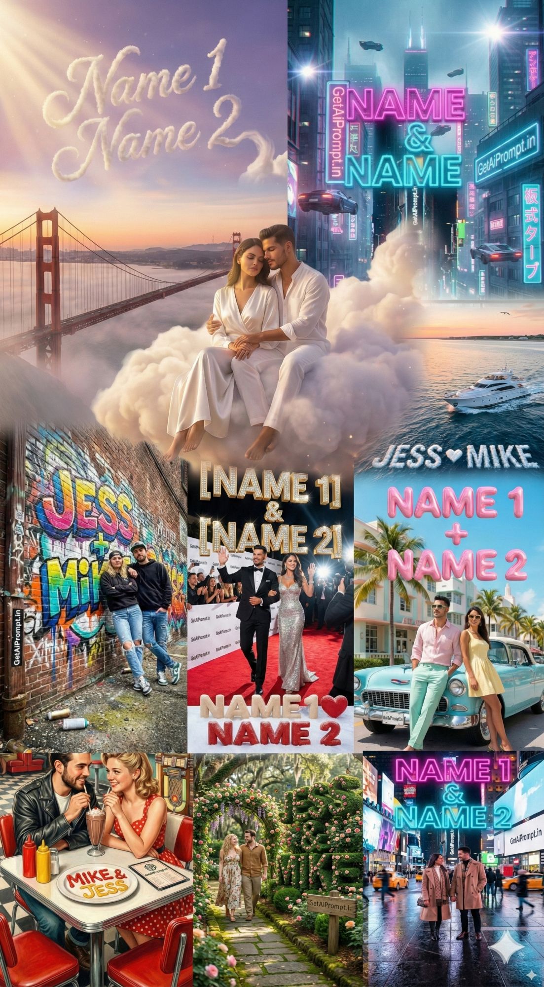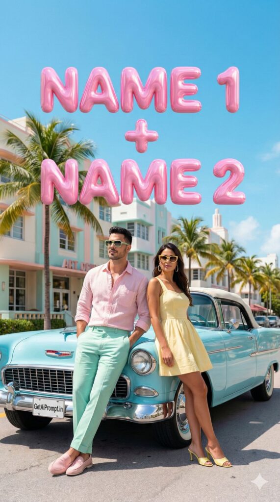 [Visual Style: Pastel Pop Art & Minimalist] [CRITICAL: ensure the subjects have a 100% identical facial structure, skin tone, and features as the reference image provided] [Subject: The couple leaning against a vintage convertible car on Ocean Drive, Miami] [Action: Wearing sunglasses, striking a cool pose] [Outfit: Retro 80s inspired pastel shirts, linen trousers, summer dresses] [3D Typography Feature: Massive, glossy, bubble-gum style 3D balloon letters floating in the sky spelling "[INSERT NAME 1] + [INSERT NAME 2]" reflecting the sun] [Environment: Palm trees swaying, Art Deco architecture in background, bright blue clear sky] [Branding: The license plate of the vintage car clearly reads "GetAiPrompt.in"] [Tech Specs: High saturation, sharp focus, vibrant colors, studio lighting simulation outdoors, 4k, --ar 9:16]
