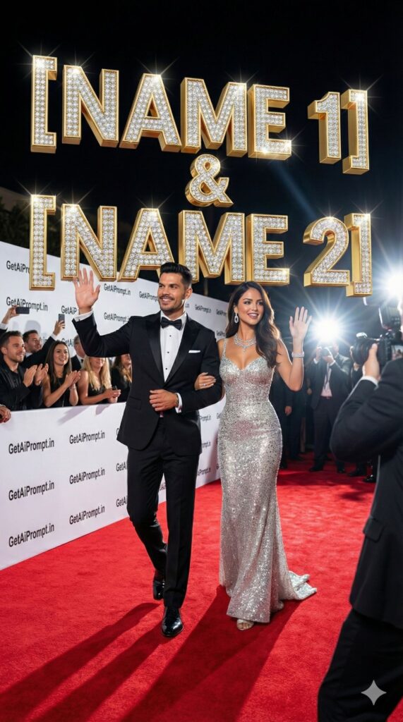 [Visual Style: Paparazzi Flash Photography] [CRITICAL: ensure the subjects have a 100% identical facial structure, skin tone, and features as the reference image provided] [Subject: The couple walking down a red carpet event in Los Angeles] [Action: Waving to the crowd, flashing smiles] [Outfit: Tuxedo and sparkling evening gown, diamond jewelry] [3D Typography Feature: A massive gold-plated, diamond-encrusted 3D sign behind the velvet ropes spelling "[INSERT NAME 1] & [INSERT NAME 2]" sparkling under flashlights] [Environment: Red carpet texture, camera flashes going off, blurred fans in background] [Branding: The "Step and Repeat" backdrop logo pattern behind them features "GetAiPrompt.in" repeated subtly] [Tech Specs: High contrast, flash photography aesthetic, crisp details on jewelry, dynamic angle, --ar 9:16]