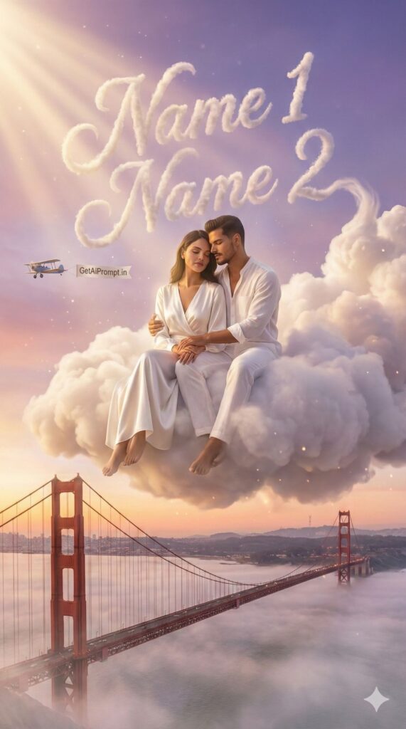 [Visual Style: Surreal Fantasy Art] [CRITICAL: ensure the subjects have a 100% identical facial structure, skin tone, and features as the reference image provided] [Subject: The couple sitting on a giant fluffy cloud drifting high above the Golden Gate Bridge] [Action: Peaceful embrace, eyes closed, serene] [Outfit: Flowing white silk aesthetic clothing, angelic vibes] [3D Typography Feature: Clouds formed into perfect, wispy 3D cursive calligraphy spelling "[INSERT NAME 1] [INSERT NAME 2]" blending into the sky] [Environment: Sunset gradients of purple and orange, golden sun rays piercing through, birds flying] [Branding: A small airplane pulling a banner in the far distance that says "GetAiPrompt.in"] [Tech Specs: Soft focus, ethereal glow, particle effects, octane render, dreamcore aesthetic, --ar 9:16]