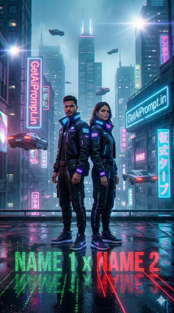 [Visual Style: Cyberpunk Sci-Fi] [CRITICAL: ensure the subjects have a 100% identical facial structure, skin tone, and features as the reference image provided] [Subject: The couple standing on a futuristic rooftop overlooking a high-tech version of Chicago] [Action: Back to back, looking cool, illuminated by holograms] [Outfit: Tech-wear jackets, glowing LED accessories, futuristic sneakers] [3D Typography Feature: Glitching, holographic 3D data-stream text projecting from the ground spelling "[INSERT NAME 1] x [INSERT NAME 2]" in matrix green and laser red] [Environment: Rain slicked streets, flying cars, neon Japanese and English signs, foggy atmosphere] [Branding: A neon sign on a nearby building glows with "GetAiPrompt.in" in cyberpunk font] [Tech Specs: Chromatic aberration, lens flare, high contrast, digital art style, 8k resolution, --ar 9:16]