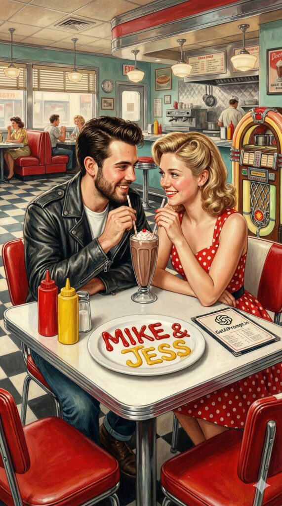 [Visual Style: Norman Rockwell Realistic Painting style] [CRITICAL: ensure the subjects have a 100% identical facial structure, skin tone, and features as the reference image provided] [Subject: The couple sharing a milkshake at a booth in a classic 1950s American Diner] [Action: Sharing a straw, looking into eyes] [Outfit: Leather jacket, polka dot dress, retro hair styling] [3D Typography Feature: The ketchup and mustard arranged artistically on the table form raised 3D liquid lettering spelling "[INSERT NAME 1] & [INSERT NAME 2]"] [Environment: Checkerboard floor, jukebox in corner, red vinyl seats, chrome details] [Branding: The menu on the table has the logo "GetAiPrompt.in" on the cover] [Tech Specs: Warm interior lighting, film grain texture, detailed food photography, realistic shading, --ar 9:16]