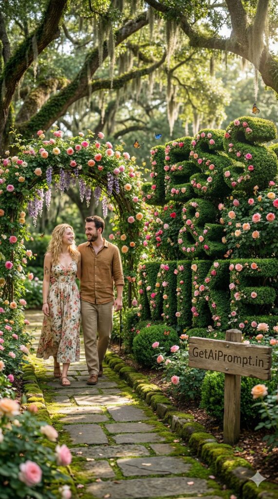 [Visual Style: Organic Nature Photography] [CRITICAL: ensure the subjects have a 100% identical facial structure, skin tone, and features as the reference image provided] [Subject: The couple standing in a lush, magical botanical garden in Savannah, Georgia] [Action: Walking through a flower archway] [Outfit: Earth tones, linen shirts, floral patterns, boho chic] [3D Typography Feature: Massive 3D topiary bushes trimmed perfectly into the shape of the names "[INSERT NAME 1] & [INSERT NAME 2]" surrounded by blooming roses] [Environment: Hanging wisteria, butterflies, dappled sunlight filtering through trees, mossy path] [Branding: A wooden rustic signpost next to the path has "GetAiPrompt.in" carved into it] [Tech Specs: Natural lighting, high dynamic range, intricate details on petals and leaves, 8k, --ar 9:16]