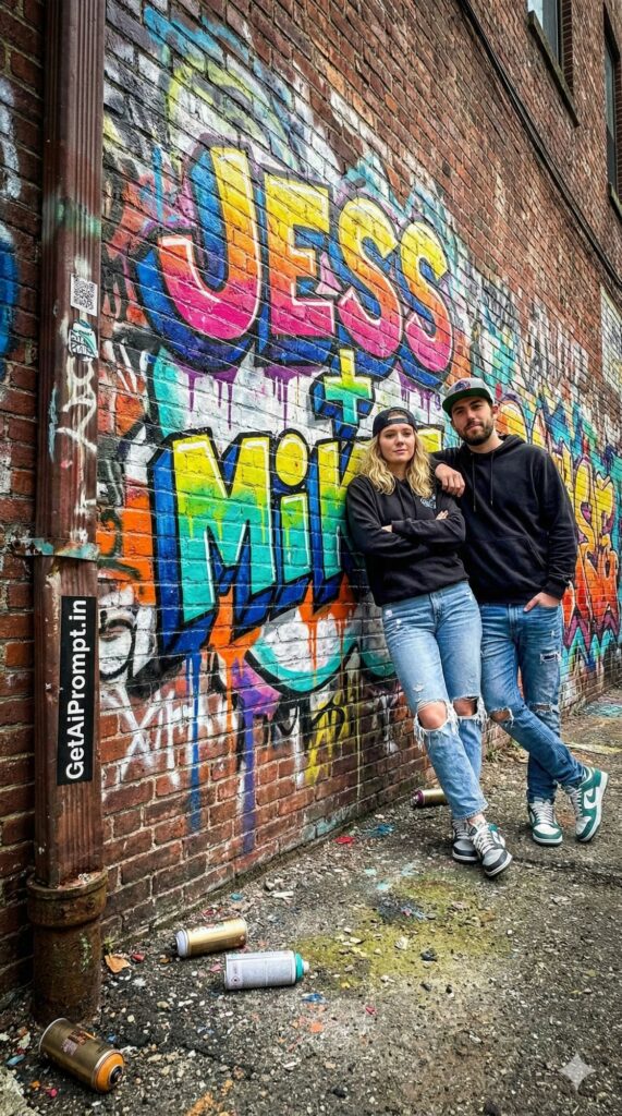 [Visual Style: Street Art & Hip Hop Culture] [CRITICAL: ensure the subjects have a 100% identical facial structure, skin tone, and features as the reference image provided] [Subject: The couple posing against a brick wall in a Brooklyn art alleyway] [Action: Leaning coolly, arms crossed or arm around shoulder] [Outfit: Hoodies, ripped jeans, cool sneakers, snapback caps] [3D Typography Feature: The graffiti on the wall is popping out in literal 3D layers, spray paint style, spelling "[INSERT NAME 1] + [INSERT NAME 2]" with dripping paint effects] [Environment: Spray paint cans on floor, gritty texture, urban decay beauty, vibrant colors] [Branding: A sticker slapped onto a drainpipe in the foreground reads "GetAiPrompt.in"] [Tech Specs: High contrast, vivid colors, texture emphasis, wide angle lens, sharp details, --ar 9:16]
