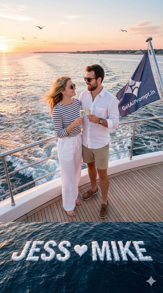 [Visual Style: Luxury Lifestyle Photography] [CRITICAL: ensure the subjects have a 100% identical facial structure, skin tone, and features as the reference image provided] [Subject: The couple relaxing on the deck of a super-yacht off the coast of The Hamptons] [Action: Clinking champagne glasses, wind in hair] [Outfit: Nautical stripes, white linen, boat shoes, sunglasses] [3D Typography Feature: The wake of the boat in the dark blue ocean water forms distinct, white foam 3D letters spelling "[INSERT NAME 1] ❤️ [INSERT NAME 2]"] [Environment: Deep blue ocean, clear horizon, sunset colors reflecting on water, seagulls] [Branding: The flag flying at the back of the yacht displays the "GetAiPrompt.in" logo] [Tech Specs: Fast shutter speed to freeze water, polarized lens look, bright and airy, 4k, --ar 9:16]