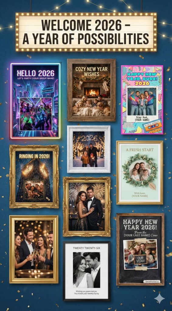 Generic e-cards are out. This year, it’s about personalized magic. We’ve curated a collection of AI prompts that transform your photos into high-end, custom New Year cards for 2026. From the “Golden Gala” luxury to the “Hygge Home” coziness, these templates are designed to impress.
