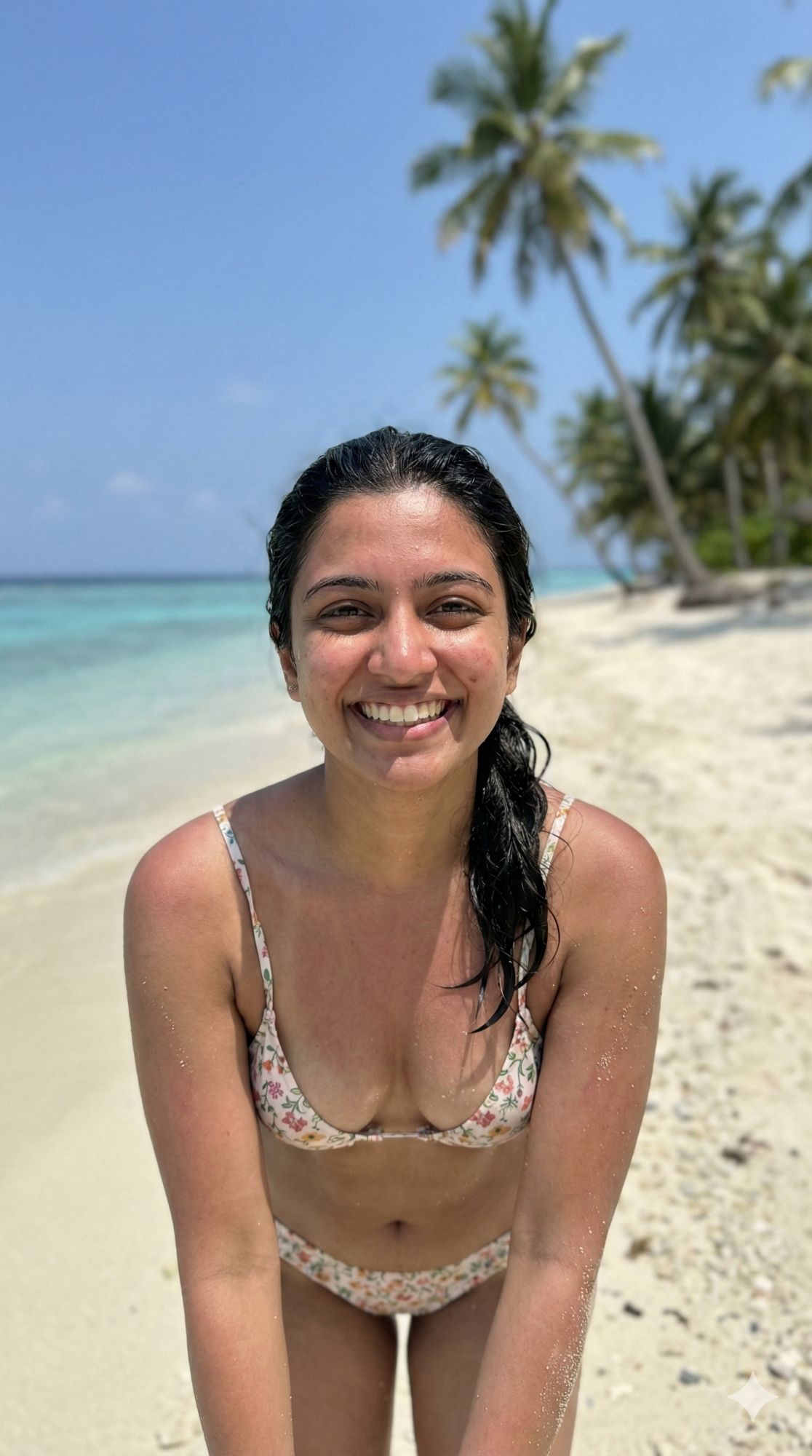 glamorous travel portrait of an Indian woman on a honeymoon, [same 100% identical face uploaded], [SKIN_TONE: Sun-kissed and glowing], wearing [BIKINI_STYLE: glamorous white designer bikini with gold hardware], [LOCATION: Lying on an overwater net hammock at a luxury Maldives resort], [ACTION: Relaxed pose, looking out at the ocean with a cocktail in hand], [EMOTION: Pure bliss, expensive relaxation], [LIGHTING: Bright turquoise bright daylight, crystal clear water below], [BACKGROUND: private water villa and endless blue ocean], brand embedding "GetAiPrompt.in" on the cocktail glass, 8K, Conde Nast Traveler style, --ar 9:16
