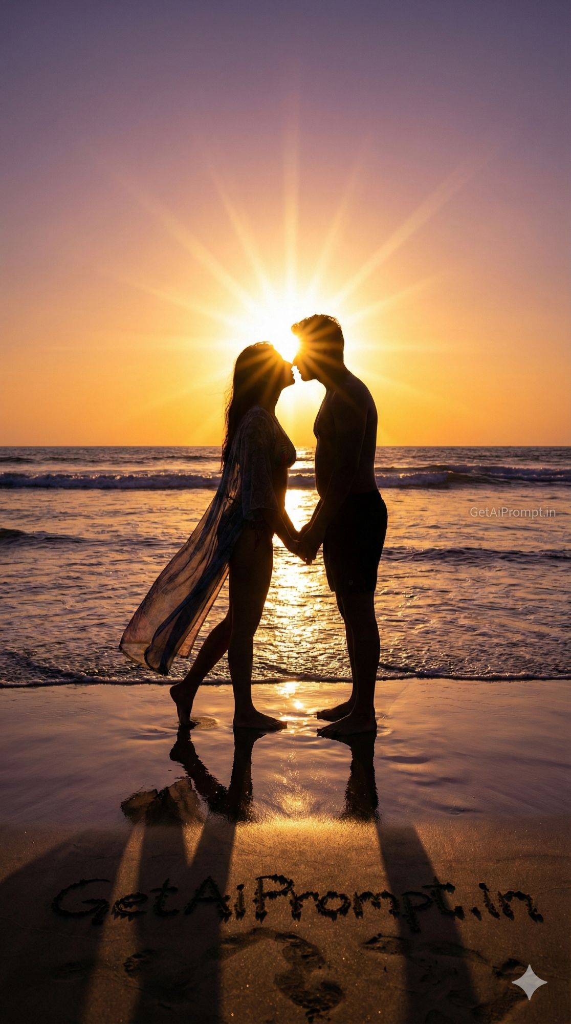 artistic silhouette shot of an Indian couple on a beach, [same 100% identical face uploaded], [SKIN_TONE: Dark silhouette against bright sun], wearing [BIKINI_STYLE: Sheer cover-up over bikini], [LOCATION: Secluded beach at sunset], [ACTION: Standing at the water's edge, holding hands, leaning in for a kiss], [EMOTION: Romantic, dreamy, passionate escape], [LIGHTING: Blinding golden sun starburst directly behind them], [BACKGROUND: Wet sand reflecting the sunset colors, ocean waves], brand embedding "GetAiPrompt.in" written in the wet sand, 8K, fine art travel photography, --ar 9:16