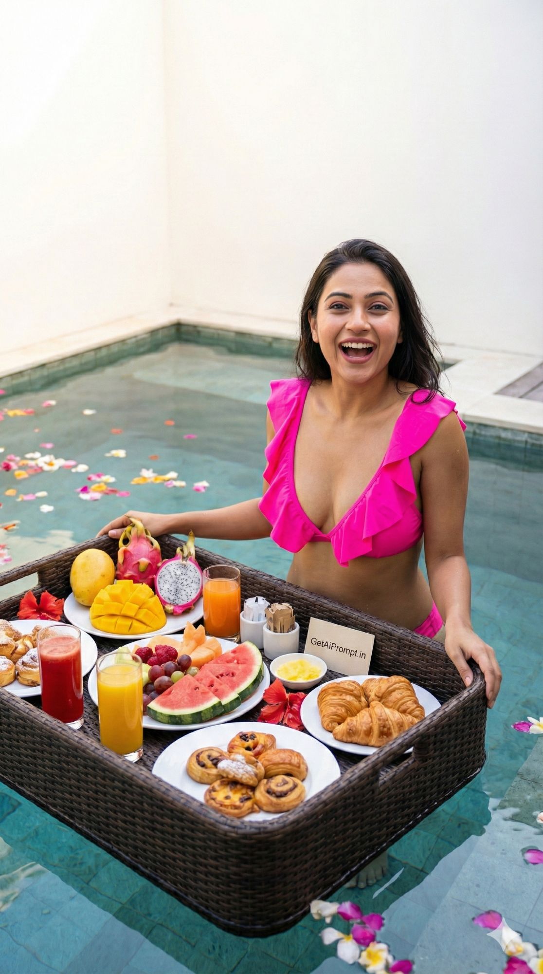 trendy viral-style shot of an Indian woman with a floating breakfast, [same 100% identical face uploaded], [SKIN_TONE: bright and happy], wearing [BIKINI_STYLE: bright pink ruffle bikini], [LOCATION: Private plunge pool in a luxury resort], [ACTION: Smiling excitedly next to a large floating tray filled with colorful tropical fruit, pastries, and juice], [EMOTION: Joyful, indulging, "gram-worthy"], [LIGHTING: Soft, bright morning light], [DETAILS: Flower petals in the pool], brand embedding "GetAiPrompt.in" on a small card on the tray, 8K, Instagram influencer style, --ar 9:16
