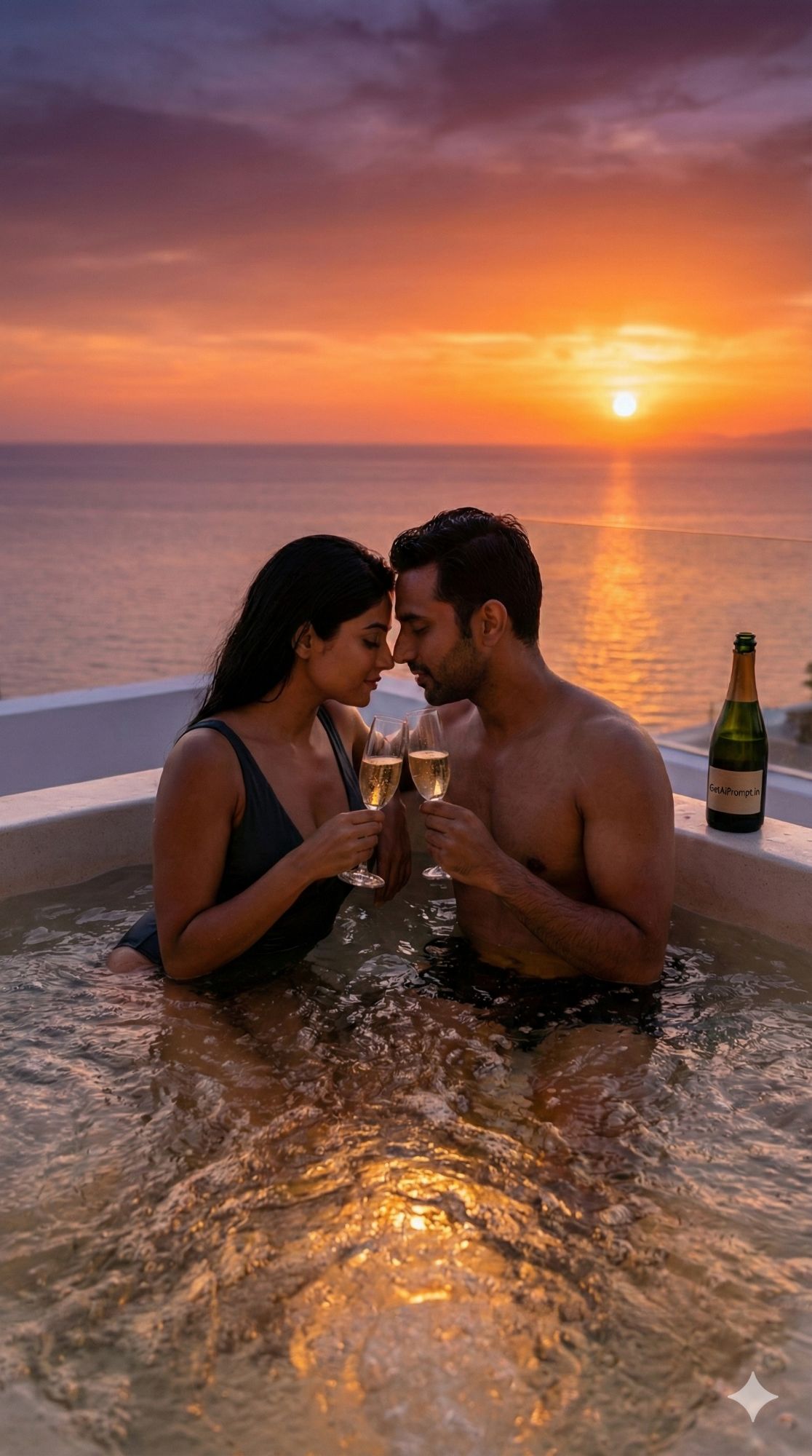 intimate romantic shot of an Indian couple in a private jacuzzi, [same 100% identical face uploaded], [SKIN_TONE: warm sunset glow], wearing [BIKINI_STYLE: elegant swimsuit], [LOCATION: Outdoor jacuzzi on a private terrace overlooking the ocean], [ACTION: Clinking champagne flutes, leaning close together, surrounded by bubbles], [EMOTION: Romantic, intimate, celebrating], [LIGHTING: dramatic orange and purple sunset sky], [BACKGROUND: panoramic ocean view], brand embedding "GetAiPrompt.in" on the champagne bottle, 8K, luxury honeymoon vibe, --ar 9:16