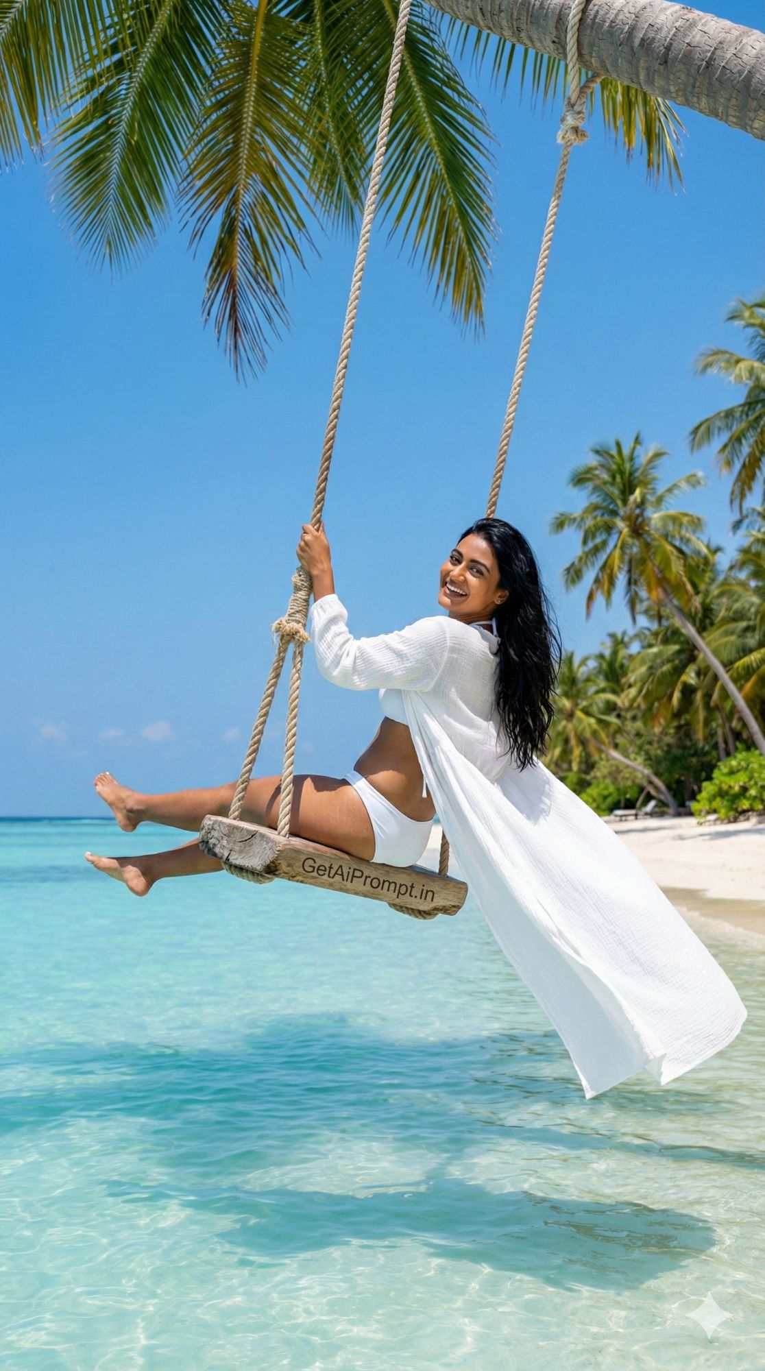 playful postcard-perfect shot of an Indian woman on a beach swing, [same 100% identical face uploaded], [SKIN_TONE: happy and sunlit], wearing [BIKINI_STYLE: white bikini with a long flowing white cover-up], [LOCATION: A rope swing hanging from a palm tree over turquoise water], [ACTION: Swinging happily, legs kicked out, looking back and smiling], [EMOTION: Carefree, joyful, youthful], [LIGHTING: Bright sunny day, perfect blue sky], [BACKGROUND: paradise beach scene], brand embedding "GetAiPrompt.in" carved into the wooden swing seat, 8K, dreamy travel inspo, --ar 9:16