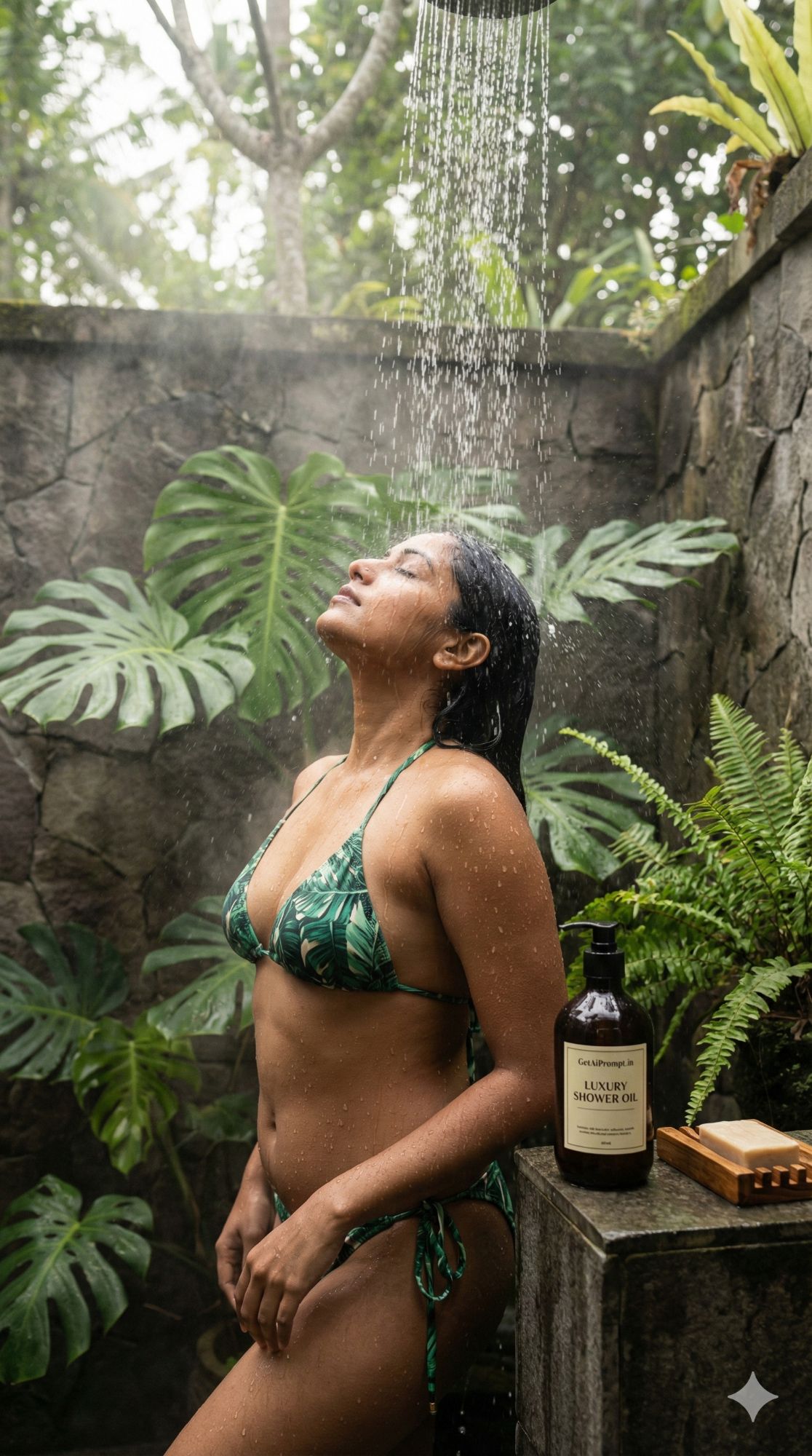 sensory detail shot of an Indian woman in an outdoor jungle shower, [same 100% identical face uploaded], [SKIN_TONE: Wet and glistening], wearing [BIKINI_STYLE: Tropical green print bikini], [LOCATION: Private outdoor stone bathroom in a Balinese villa], [ACTION: Tilting head back, letting the rain shower pour over her face], [EMOTION: Refreshing, pure, cleansing], [LIGHTING: Soft diffused jungle light], [DETAILS: Water splashing off skin, steam rising, lush monsterra leaves], brand embedding "GetAiPrompt.in" on a bottle of luxury shower oil, 8K, spa wellness vibe, --ar 9:16