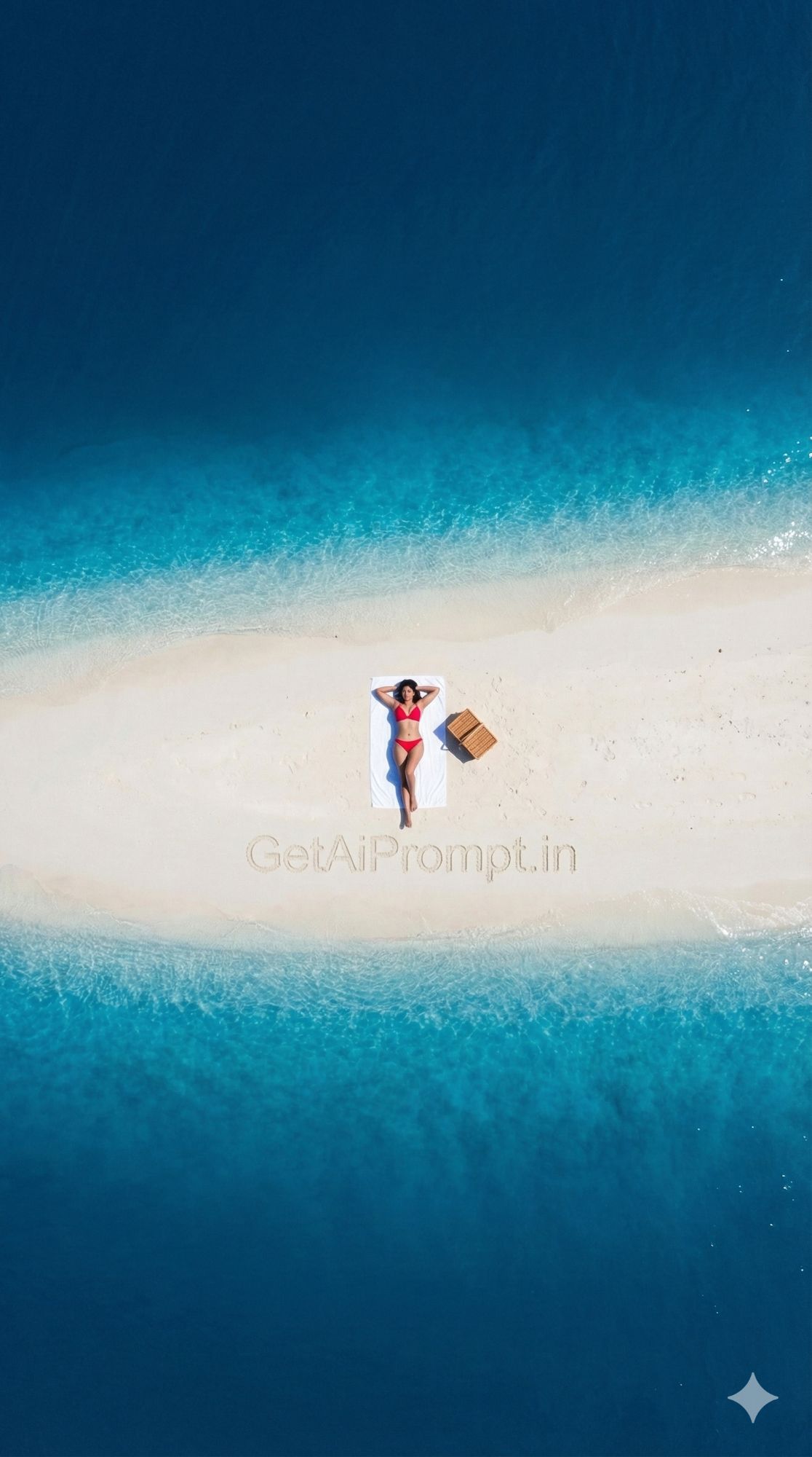high-angle aerial drone shot of an Indian woman on a sandbank, [same 100% identical face uploaded], [SKIN_TONE: Small but detailed], wearing [BIKINI_STYLE: Red bikini making a visual pop], [LOCATION: A tiny strip of white sand surrounded by deep blue ocean], [ACTION: Lying on a white towel next to a picnic basket], [EMOTION: Total isolation, "Last person on earth" vibe], [LIGHTING: Bright high-noon sun, no shadows], [COMPOSITION: Minimalist, vast negative space of water], brand embedding "GetAiPrompt.in" written large in the sand, 8K, fine art aerial photography, --ar 9:16