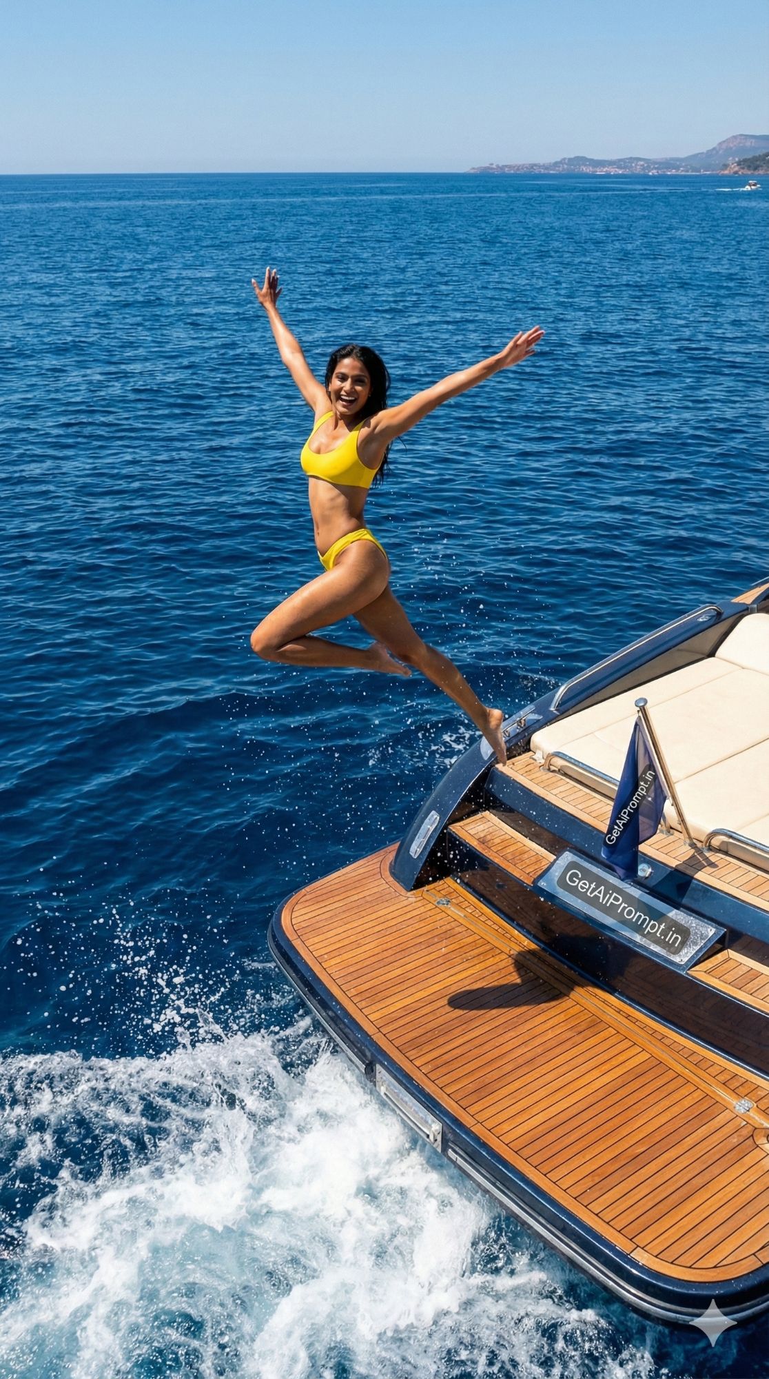 dynamic action freeze-frame shot of an Indian woman jumping off a boat, [same 100% identical face uploaded], [SKIN_TONE: Sunlit], wearing [BIKINI_STYLE: Sporty yellow bikini], [LOCATION: Stern (back) of a luxury speedboat in the Mediterranean], [ACTION: Mid-air jump, diving into the deep blue sea], [EMOTION: Thrill, energy, freedom], [LIGHTING: Bright sunlight, high shutter speed], [DETAILS: Water splash frozen in air, wake of the boat], brand embedding "GetAiPrompt.in" on the boat flag, 8K, GoPro lifestyle aesthetic, --ar 9:16