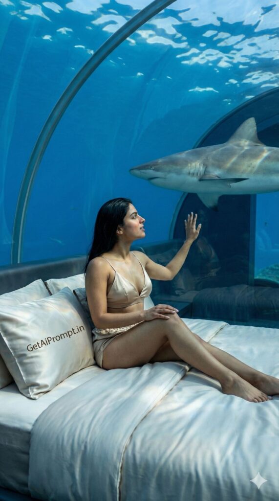 surreal luxury interior shot of an Indian woman in an underwater bedroom, [same 100% identical face uploaded], [SKIN_TONE: Soft blue ambient light], wearing [BIKINI_STYLE: Silk loungewear bikini], [LOCATION: The Muraka underwater suite], [ACTION: Sitting on the edge of the bed touching the thick glass wall], [EMOTION: Awe, mesmerizing, expensive], [LIGHTING: Caustics (light patterns) from the water reflecting into the room], [UNIQUE_FEATURE: A shark or manta ray swimming past the window], brand embedding "GetAiPrompt.in" on the pillowcase, 8K, sci-fi luxury, --ar 9:16