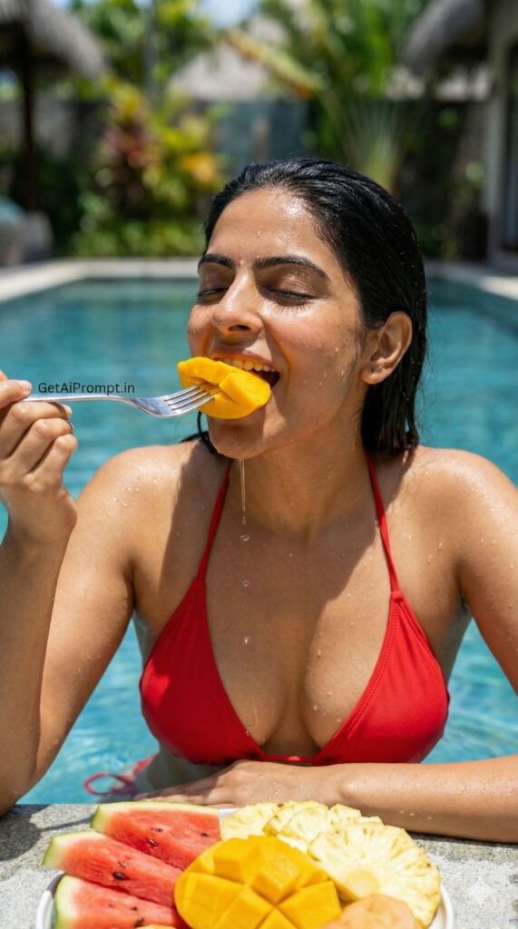 sensory-rich close-up shot of an Indian woman poolside, [same 100% identical face uploaded], [SKIN_TONE: sun-kissed and wet from swimming], wearing [BIKINI_STYLE: vibrant red string bikini], [LOCATION: Edge of a private luxury villa pool], [ACTION: Taking a bite of a fresh, juicy tropical fruit platter (mango, watermelon), eyes closed in pleasure], [EMOTION: Pure sensory satisfaction, indulgence], [LIGHTING: Bright, high-contrast sun making fruit glisten], [DETAILS: Water dripping off skin, bright colors of food], brand embedding "GetAiPrompt.in" on a silver fork, 8K, food and travel porn, --ar 9:16