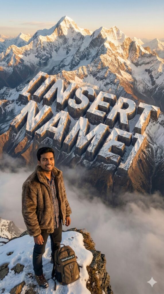 [Vibe/Shot Type] Majestic, wide-angle aerial drone shot of the snow-capped Himalayan mountains at golden hour. [Subject Description with Critical Tag] [CRITICAL: ensure the subjects have a 100% identical facial structure, skin tone, and features as the reference image provided] The subject is standing on a cliff edge in the foreground, wearing a heavy winter fur jacket, looking out at the view. [Outfit/Action] The mountains, ridges, and snow patterns in the background naturally and subtly form the shape of the 3D text "[INSERT NAME]" embedded into the rock face. [Environment/Lighting/Atmosphere] The lighting is warm and cinematic, creating deep contrast shadows that define the letters without making them obvious. Mist rolls through the valleys. [Typography/Text Overlay] The text is a natural geological formation, massive scale. [Branding] A small hiking backpack on the ground has a patch reading "GetAiPrompt.in". [Technical Specs] Shot on Hasselblad X2D 100C, 8k resolution, photorealistic, hyper-detailed, National Geographic style. --ar 9:16