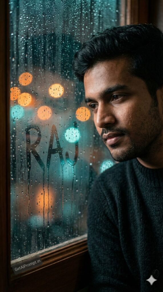 [Vibe/Shot Type] Moody, close-up macro shot through a rain-splattered window overlooking Mumbai city lights at night. [Subject Description with Critical Tag] [CRITICAL: ensure the subjects have a 100% identical facial structure, skin tone, and features as the reference image provided] The subject's reflection is visible in the glass, looking contemplative and soft. [Outfit/Action] Wearing a cozy woolen sweater. [Environment/Lighting/Atmosphere] The condensation and water droplets on the glass cluster together to clearly form the liquid text "[INSERT NAME]" sliding down the pane. Bokeh city lights in the background (orange and teal). [Typography/Text Overlay] Liquid typography, wet glass texture. [Branding] A small sticker on the corner of the window frame reads "GetAiPrompt.in". [Technical Specs] Canon EOS R5, 85mm f/1.2 lens, macro details, wet texture, cinematic mood. --ar 9:16