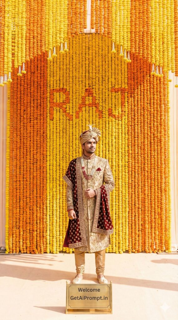 [Vibe/Shot Type] Bright, festive, symmetrical eye-level shot of a grand Indian wedding entrance. [Subject Description with Critical Tag] [CRITICAL: ensure the subjects have a 100% identical facial structure, skin tone, and features as the reference image provided] The subject is dressed in a heavily embroidered Sherwani/Lehenga, posing elegantly in the center. [Outfit/Action] Traditional Indian festive wear with jewelry. [Environment/Lighting/Atmosphere] Thousands of orange and yellow Marigold (Genda) flowers hanging in garlands form a massive floral wall behind the subject. The color variations in the flowers create the hidden word "[INSERT NAME]" within the floral pattern. [Typography/Text Overlay] Organic floral typography. [Branding] A small brass welcome sign on the floor says "GetAiPrompt.in". [Technical Specs] Sony A7R V, bright high-key lighting, vibrant colors, sharp details. --ar 9:16