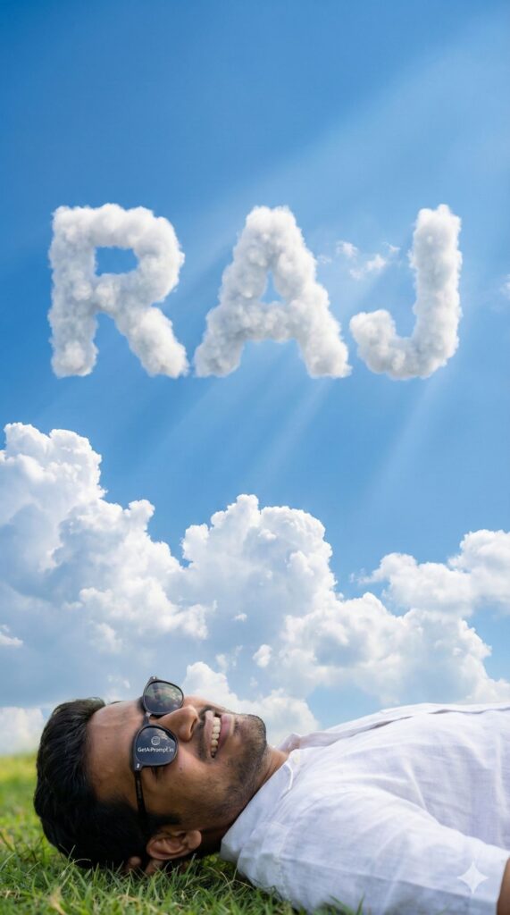 [Vibe/Shot Type] Ethereal, low-angle shot looking up at a brilliant blue sky dotted with fluffy white cumulus clouds. [Subject Description with Critical Tag] [CRITICAL: ensure the subjects have a 100% identical facial structure, skin tone, and features as the reference image provided] The subject is lying on green grass at the bottom of the frame, looking up, wearing sunglasses. [Outfit/Action] Summer casuals, white linen shirt. [Environment/Lighting/Atmosphere] The clouds are arranged in a specific formation that creates the fluffy, soft 3D text "[INSERT NAME]" floating in the sky. Sunrays (God rays) pierce through the letters. [Typography/Text Overlay] Cloud formation typography, soft edges. [Branding] The sunglasses reflection shows a tiny logo "GetAiPrompt.in". [Technical Specs] Nikon Z9, wide dynamic range, polarized blue sky, dreamy atmosphere. --ar 9:16