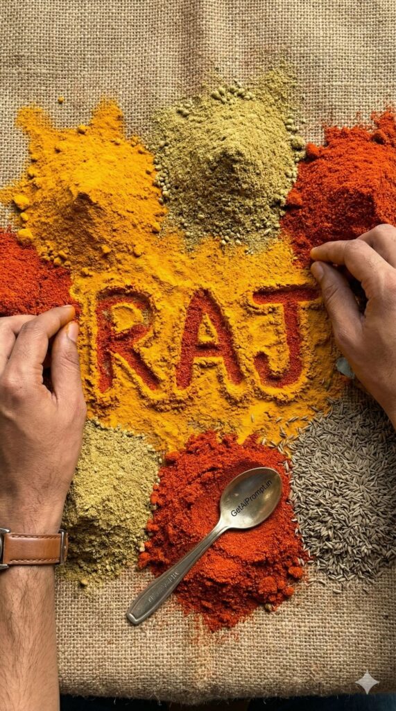[Vibe/Shot Type] Top-down flat lay photography of heaps of colorful Indian spices (Turmeric, Red Chili, Coriander) in a market. [Subject Description with Critical Tag] [CRITICAL: ensure the subjects have a 100% identical facial structure, skin tone, and features as the reference image provided] The subject's hands are visible at the edges, arranging the spices. [Outfit/Action] Wearing rustic bangles or a watch. [Environment/Lighting/Atmosphere] The powders are spilled and arranged on a burlap sack surface to form the textured, powdery text "[INSERT NAME]" in vibrant red and yellow. [Typography/Text Overlay] Powder/Dust typography, high texture. [Branding] A small metal spoon in the spice pile is engraved with "GetAiPrompt.in". [Technical Specs] Macro lens, incredibly high texture detail, appetizing colors. --ar 9:16