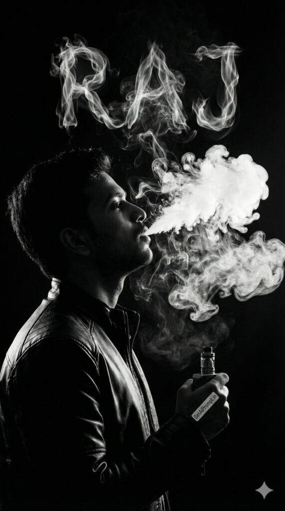 [Vibe/Shot Type] Dramatic, high-contrast studio shot with a black background. [Subject Description with Critical Tag] [CRITICAL: ensure the subjects have a 100% identical facial structure, skin tone, and features as the reference image provided] The subject is silhouetted against a backlight, blowing smoke or vapor. [Outfit/Action] Leather jacket, edgy style. [Environment/Lighting/Atmosphere] The swirling white smoke plumes freeze in mid-air to form the ghostly, wispy text "[INSERT NAME]". Volumetric lighting highlights the smoke texture. [Typography/Text Overlay] Smoke simulation typography. [Branding] The vape device or cigarette lighter has a decal "GetAiPrompt.in". [Technical Specs] Studio strobe lighting, freeze motion, monochrome with silver tones. --ar 9:16