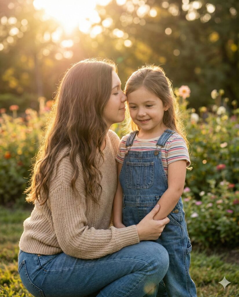 A heartwarming, hyper-realistic cinematic photograph of a 28-year-old woman [DESCRIBE HAIR: e.g., with long curly brown hair] kneeling down to gently hug a 6-year-old girl (her younger self). The little girl looks exactly like the woman but younger. The Action: The woman has her eyes closed, resting her forehead against the child's head, looking peaceful and emotional. The child is smiling softly, feeling safe. Attire: - Woman: Wearing a cozy beige knitted sweater and jeans. - Child: Wearing a cute vintage 90s style floral dress or denim overalls. Lighting & Vibe: Soft, golden hour sunlight backlighting them. Dreamy, nostalgic atmosphere. High definition, 85mm lens. --ar 4:5