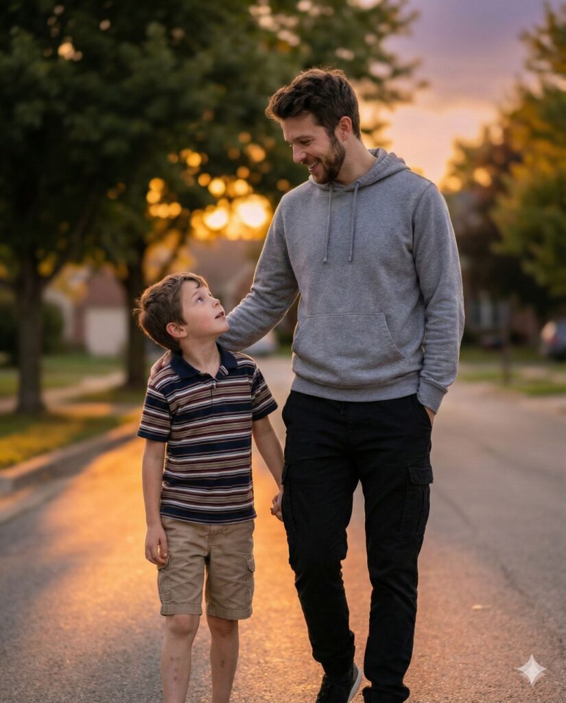 A touching, photorealistic full-body shot of a 30-year-old man [DESCRIBE HAIR/BEARD: e.g., with a short beard and dark hair] walking hand-in-hand with a 7-year-old boy (his younger self). The Action: The man is looking down at the boy with a proud and reassuring smile. The boy is looking up at the man with admiration. The man has one hand on the boy's shoulder. Attire: - Man: Wearing a casual grey hoodie and black cargo pants. - Child: Wearing a colorful striped t-shirt and shorts (nostalgic 2000s kid vibe). Background: A blurry park or a quiet suburban street during sunset. Warm, emotional tones. --ar 4:5