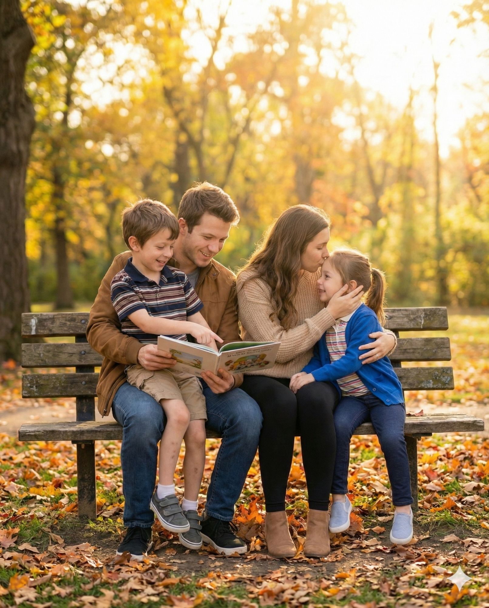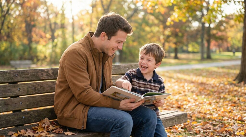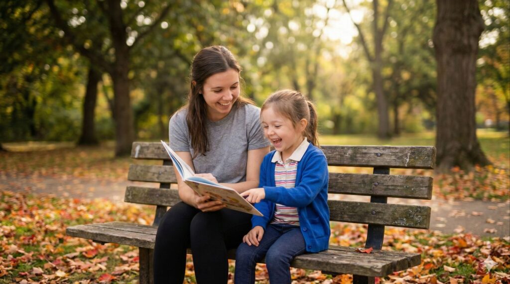 A realistic wide shot of a 25-year-old [Gender] sitting on a park bench next to a 5-year-old version of themselves. The Action: The adult is showing the child something on a phone or reading a book to them. The child is laughing. There is a strong resemblance between them. Atmosphere: Peaceful, serene, "healing the inner child" aesthetic. Fallen autumn leaves around the bench. Soft focus background. --ar 16:9