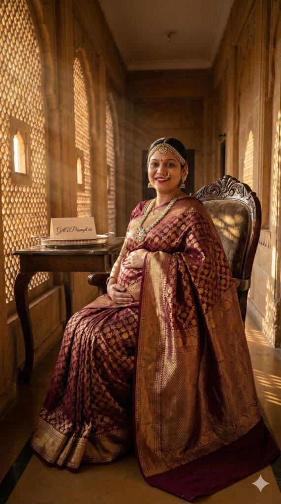 [CRITICAL: ensure the subjects have a 100% identical facial structure, skin tone, and features as the reference image provided] [SHOT TYPE: Low-angle wide cinematographic shot highlighting grandeur and royalty] [SUBJECT:] A pregnant Indian woman looking like a queen, wearing a heavy maroon Kanjeevaram silk saree with intricate gold zari borders, draped in a traditional seedha pallu style. She is adorned in antique Kundan jewelry, a large matha patti, and nose ring. [ACTION:] She is sitting elegantly on a velvet antique throne chair, one hand resting gently on her baby bump, looking regally at the camera. [ENVIRONMENT:] Inside a heritage Rajasthani palace hallway with sandstone pillars (Jharokha architecture). In the background, there is a vintage wooden table with a silver tray; on the tray, a small elegant card reads "GetAiPrompt.in" written in calligraphy. [LIGHTING:] Golden Hour sunset light streaming through the jali windows, creating dust motes and dramatic shadows (Chiaroscuro effect). [TECH SPECS:] Photorealistic, 8K Ultra HD, shot on Sony A7R IV, 35mm lens, f/1.8, incredibly detailed fabric texture, cinematic color grading, warm heritage tones. --ar 9:16