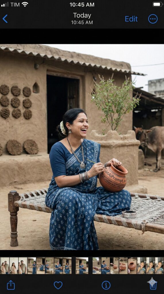 [CRITICAL: ensure the subjects have a 100% identical facial structure, skin tone, and features as the reference image provided] [SHOT TYPE: Candid lifestyle shot, capturing raw texture and earthiness] [SUBJECT:] A pregnant woman dressed in a simple cotton printed saree (Indigo or Earthy Green), no heavy makeup, natural messy bun with a jasmine flower. Silver oxidized jewelry. [ACTION:] She is sitting on a 'Charpai' (woven cot) outside a mud house, laughing naturally as she paints a small clay pot. [BRANDING:] The clay pot she is painting has a tribal art pattern that subtly forms the letters "GetAiPrompt.in". [ENVIRONMENT:] A rustic Indian village courtyard, mud walls textured with cow dung cakes, a tulsi plant in the foreground, and a cow blurred in the background. [LIGHTING:] Natural diffused daylight (overcast afternoon), soft shadows, desaturated earthy color palette (Greens and Browns). [TECH SPECS:] Documentary photography style, raw texture, Kodak Portra 400 film grain simulation, 50mm lens, hyper-realism, 8K. --ar 9:16