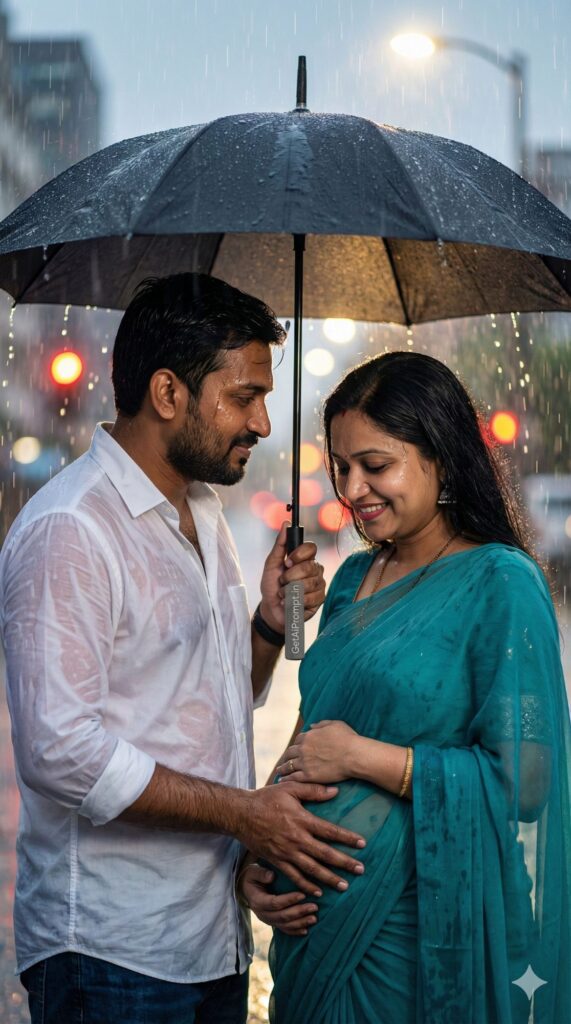 [CRITICAL: ensure the subjects have a 100% identical facial structure, skin tone, and features as the reference image provided] [SHOT TYPE: Close-up intimate couple shot, creating a sense of privacy] [SUBJECT:] An Indian couple standing under a large black umbrella in heavy rain. The husband is looking at the wife with intense love; the wife is looking down at her bump with a smile. She wears a teal chiffon saree that clings slightly due to the humidity; he wears a soaking wet white shirt. [ACTION:] The husband is sheltering her with the umbrella while holding her hand on the bump. [BRANDING:] The tag on the umbrella handle is visible and reads "GetAiPrompt.in" in silver embossing. [ENVIRONMENT:] A blurred street with city lights turning into bokeh orbs (red and yellow traffic lights) behind the rain streaks. [LIGHTING:] Backlit by a street lamp creating a "halo" effect on the rain drops, dramatic and moody lighting on faces. [TECH SPECS:] Macro details on raindrops, wet skin texture, cinematic bokeh, shutter speed 1/200, aperture f/1.4, 8K resolution, emotional atmosphere. --ar 9:16